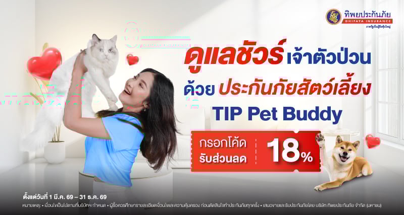 พิเศษ!! ซื้อประกันภัยสัตว์เลี้ยง TIP PET BUDDY รับส่วนลด 18%